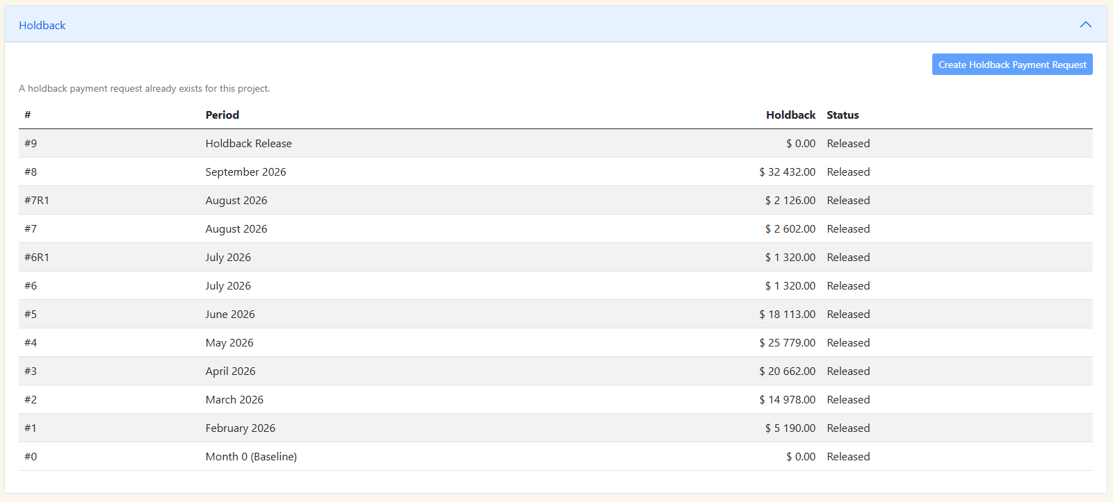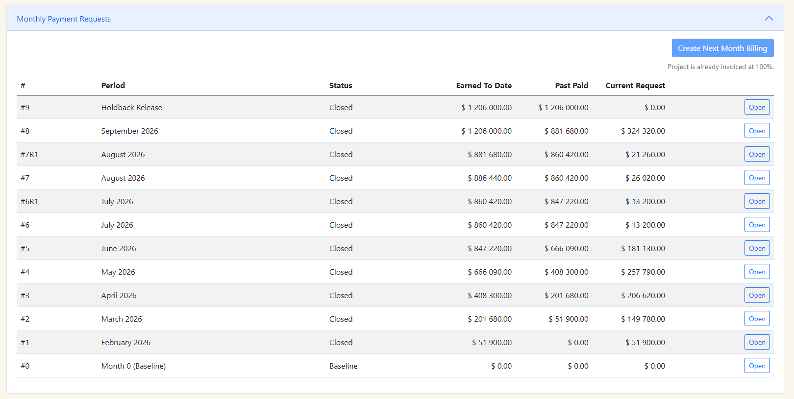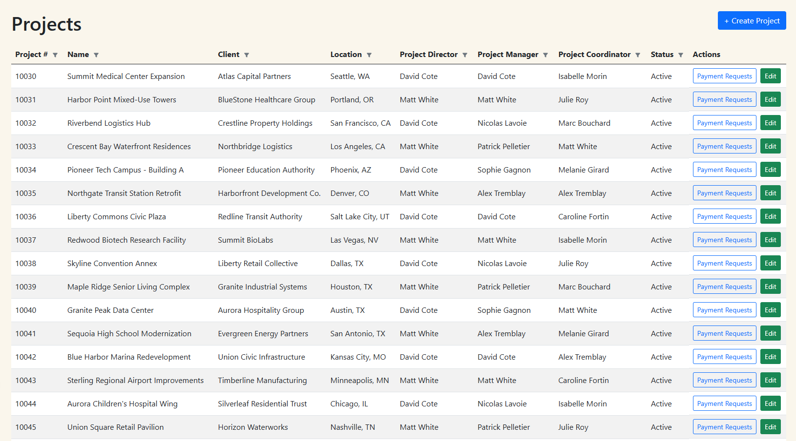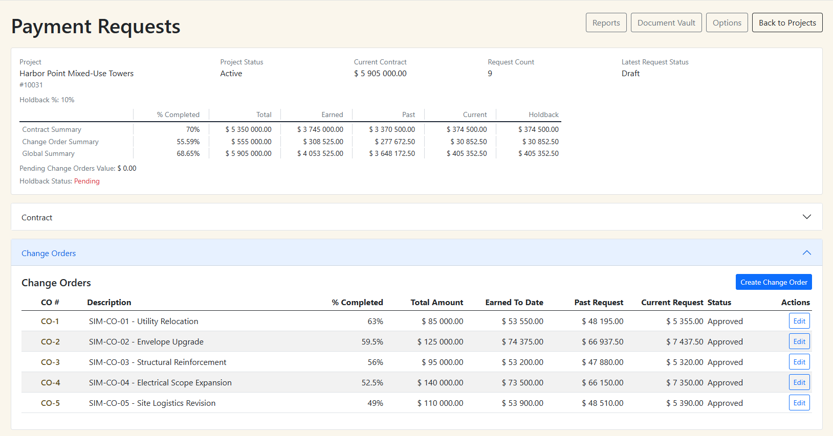 Real workflow views from project setup, payment requests, contract progress, holdback, and change orders.